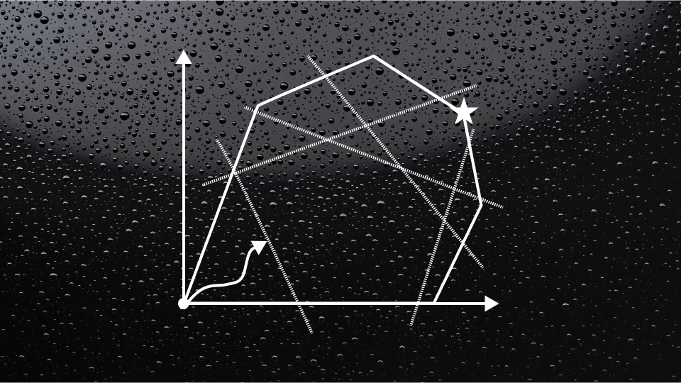 - Path 1: team decides to move upward, hits a constraint (the upper line), and then gets "stuck" at the intersection of two to three constraints: the upper dark line, and the two dashed lines. Now they need to debottleneck 2-3 things at once.